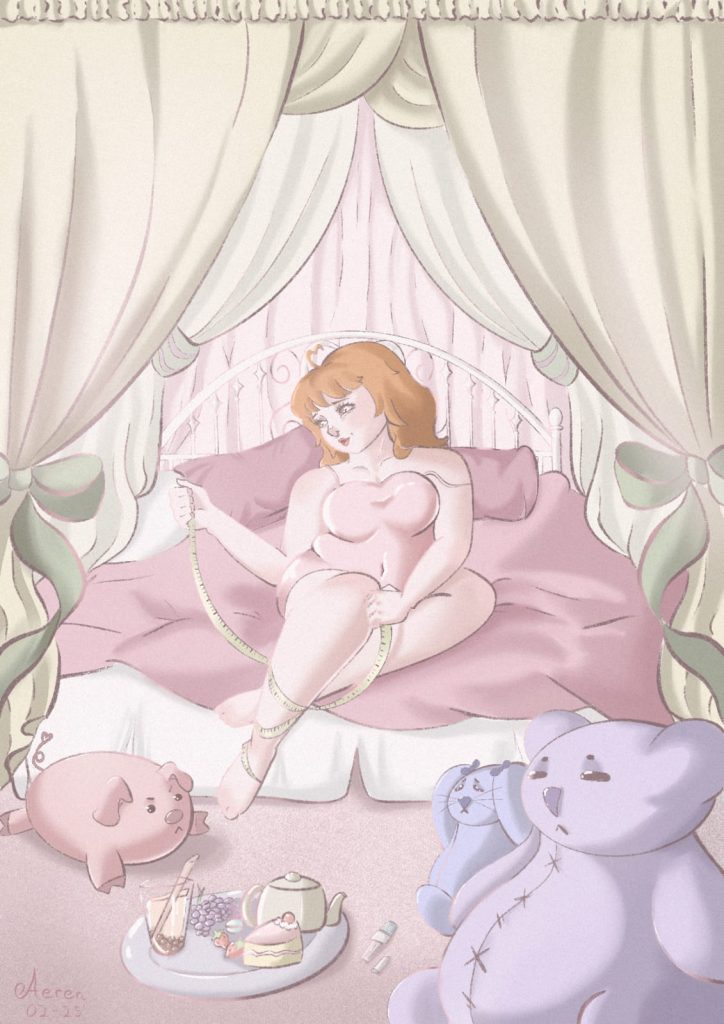 La obra, más allá de la estética pastel y suave, refleja los estragos de sufrir un trastorno alimenticio, la hiper-vigilancia del cuerpo propio y el fracaso al que está advocada la cultura de la dieta y la ortorexia, que empujan al enferm@ a recaer en hábitos nocivos.