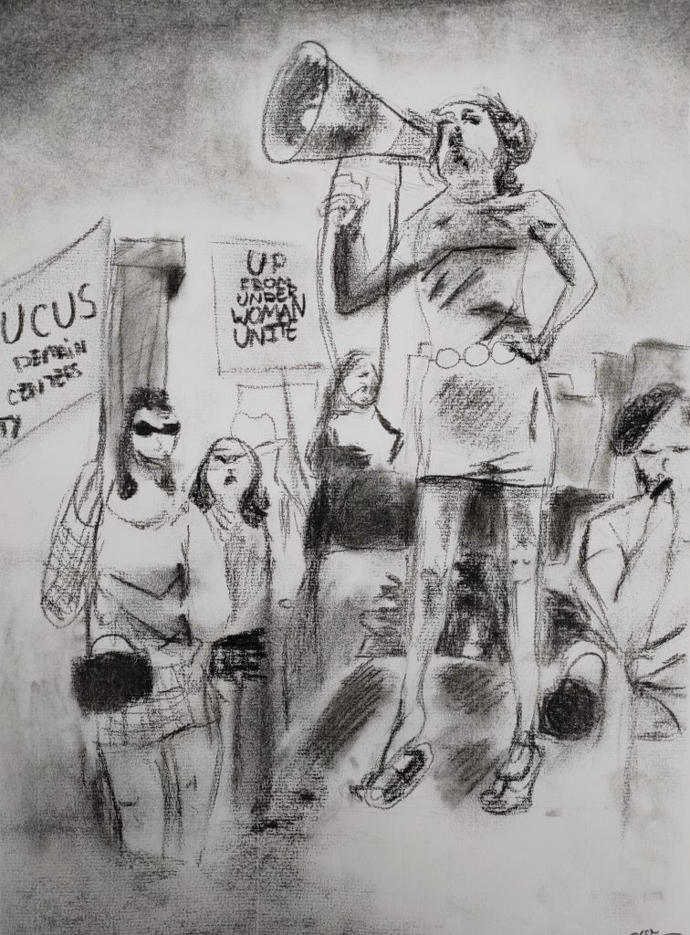 Con este trabajo busco dibujar a las que miran con asco y pena. Lo hago por y para los cuerpos que incomodan, obligados a ocultarse y silenciarse.