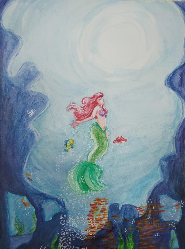 Esta obra representa a una mujer soñadora. Inspirada en la sirenita porque ella es una mujer que fantasea con ir a la superficie y al final escondida entre las rocas, peces y burbujas consigue alcanzar tal sueño.