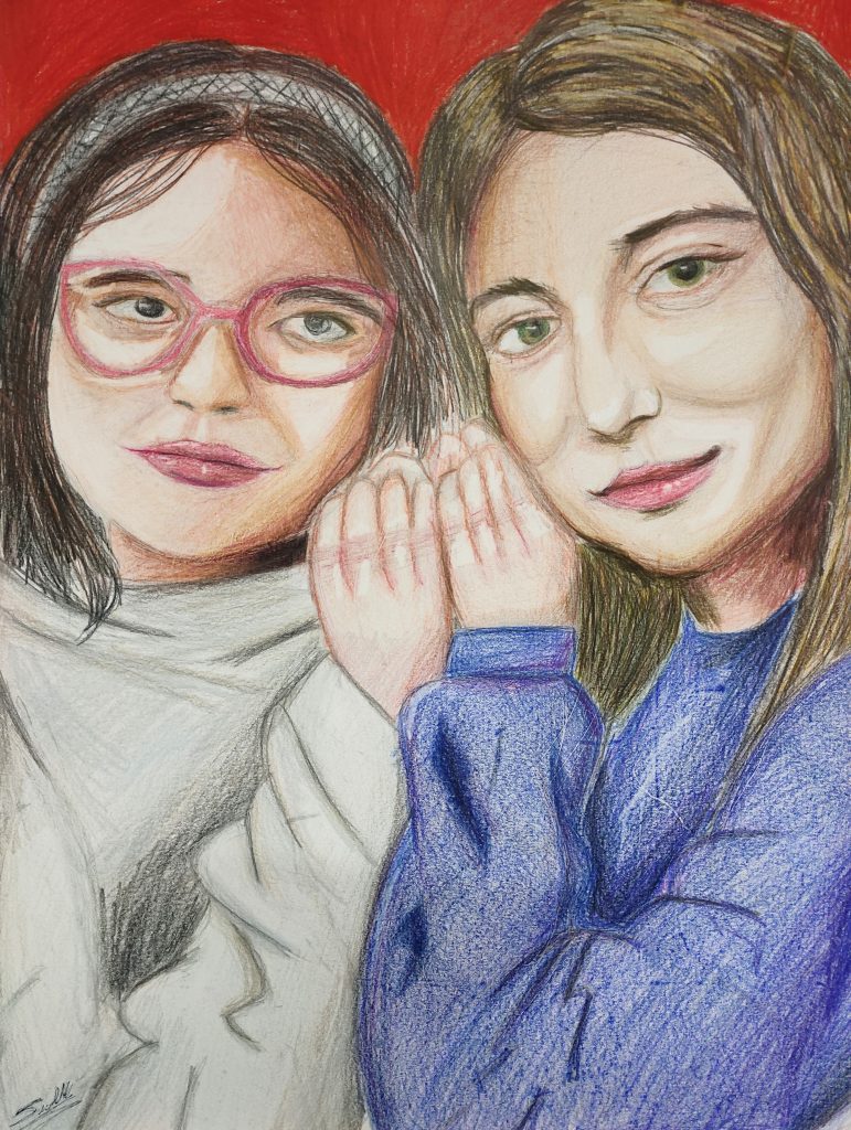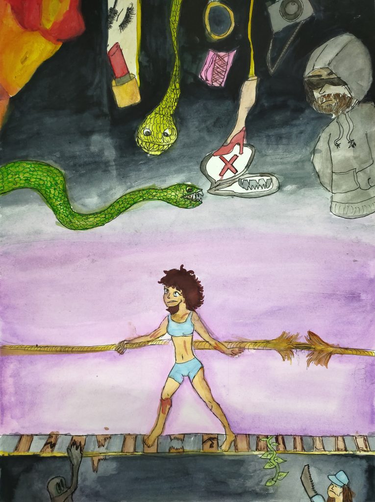 Desde la rabia, la indignación y el cansancio, he dibujado esta obra. Aunque fue la elegida, tenía otras temáticas en mente. Todavía estoy experimentando con el color y los materiales, siendo este mi primer trabajo a lápices.