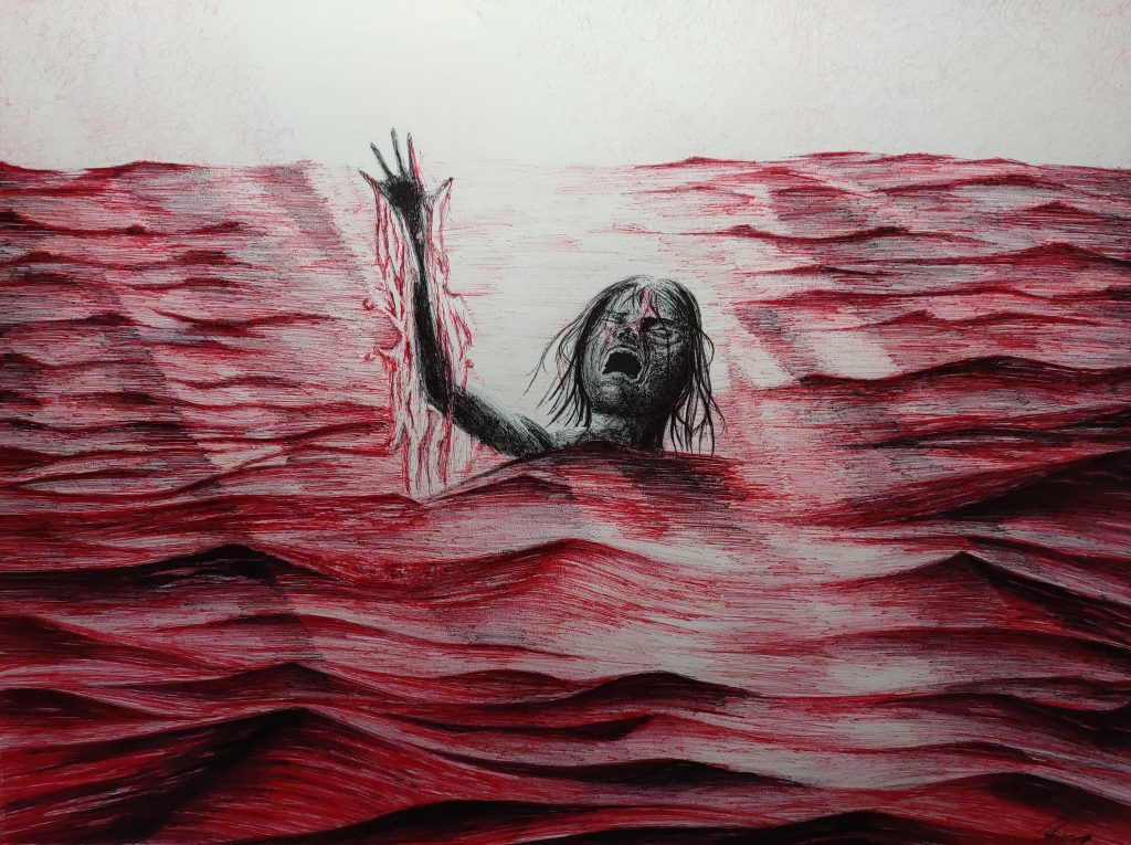 El contraste de colores representa la intensidad del dolor, los rayos de luz, la esperanza, y así formando una figura oscura que pide ayuda, en un mar denso convirtiéndolo en su propia sangre.